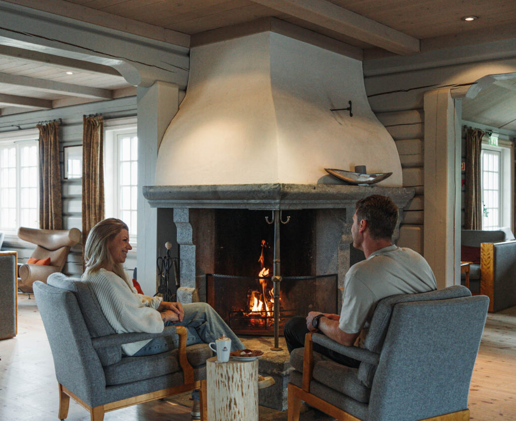 Peisestuen er hotellets naturlige møtested. Her kan du slappe av foran peisen med en kopp kaffe eller et glass vin, og nyte en rolig stund eller hyggelige samtaler etter en dag i fjellet.