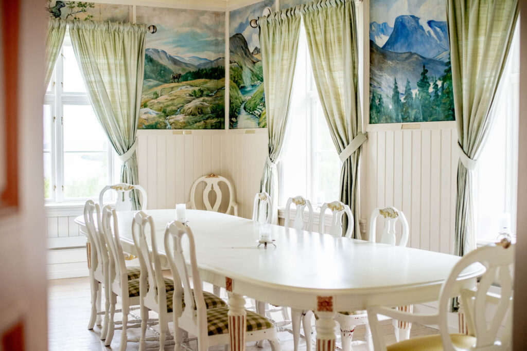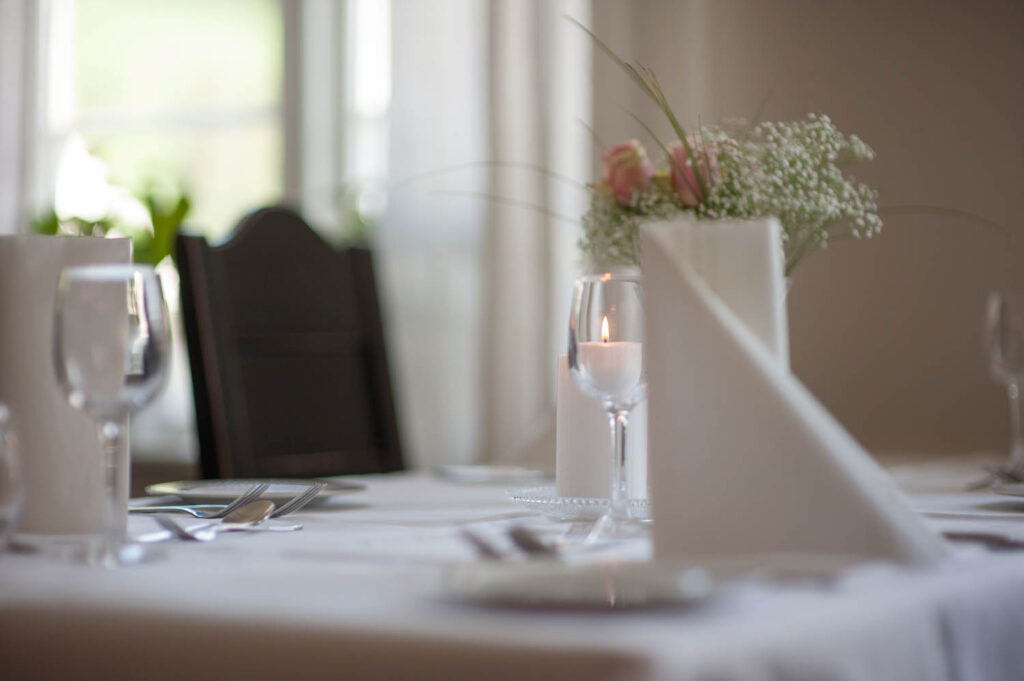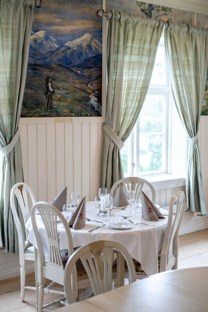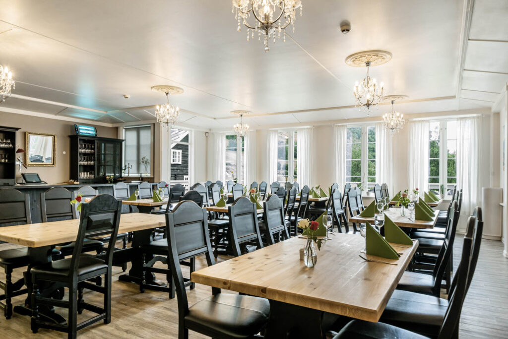 Inne i hovedhuset finner du vår restaurant – et varmt og stemningsfullt lokale med plass til opptil 90 personer. Her serverer vi alt fra enkle måltider til festmiddager, og henter inspirasjon fra både lokale råvarer og norsk matkultur. Frokost serveres også her, og er alltid inkludert når du bor hos oss.