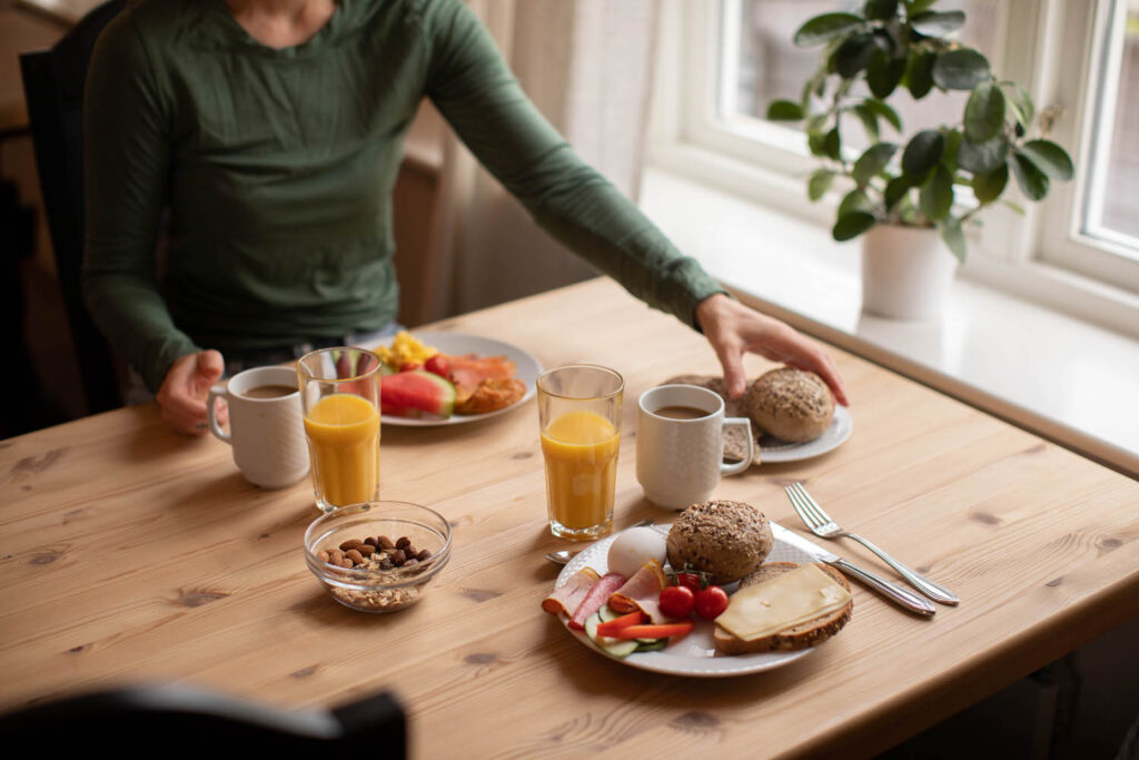 Frokost er alltid inkludert når du bor hos oss. I sommersesongen serverer vi en innholdsrik buffet med kalde og varme retter, ferskt brød, pålegg, frukt, meieriprodukter, kaffe, te og juice – samt alternativer for allergikere.